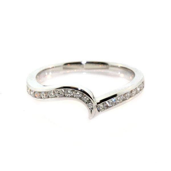 Handmade platinum diamond set wedding ring. The ring is set with 0.35cts of round brilliant cut diamonds, FG/VS-SI1. This ring design is made to order in the required finger size and with the curvature to fit your engagement ring perfectly.