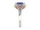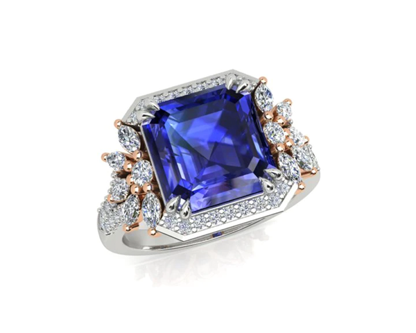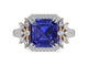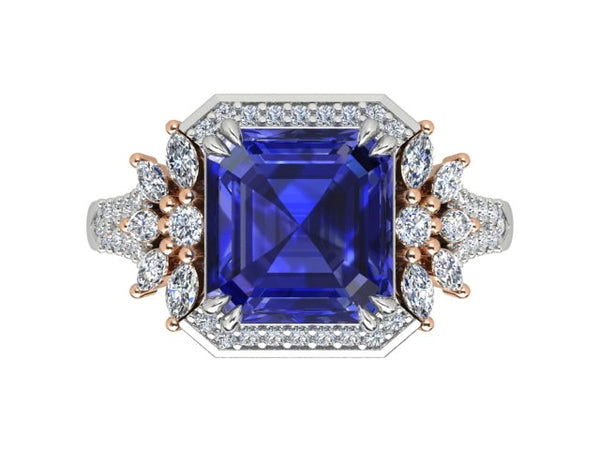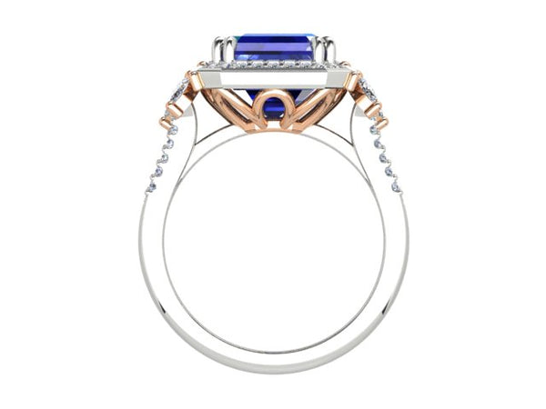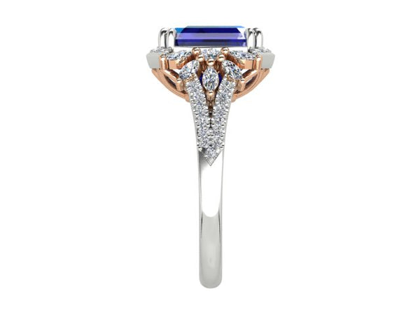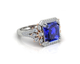 Custom-made platinum Tanzanite and Diamond cluster ring. This stunning piece is set with a 5.01ct intense violetish-blue emerald cut Tanzanite and 0.58cts of marquise cut and round brilliant cut diamonds, FG colour and VS-SI clarity.