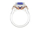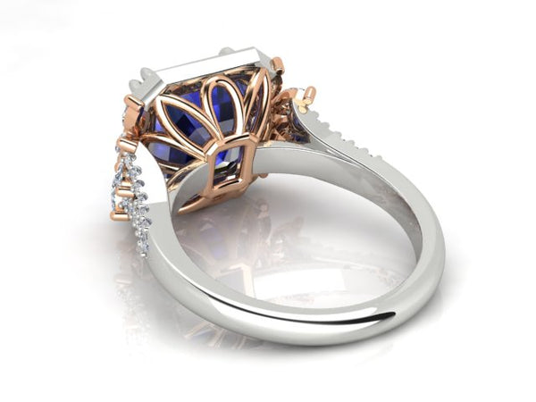 The ring can be made in platinum, yellow, white or rose gold. The ring can be ordered with a sapphire, ruby, emerald, aquamarine or tanzanite centre.