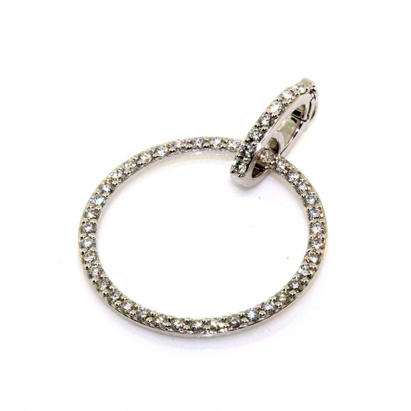 18k white gold diamond circle pendant. The diamonds are claw set into a white gold frame. The enhancer style bail is also diamond set. The pendant comes with a 9k white gold Italian diamond cut cable link chain, 45cm in length. Currently out of stock but available to order.