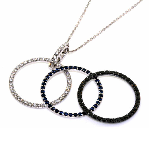This design can be made with white or black diamonds, sapphires, rubies or emeralds. The pendant is shown made with back diamonds and sapphires. The other colour combinations need to be ordered separately. The pendant can be ordered in yellow, white or rose gold.