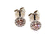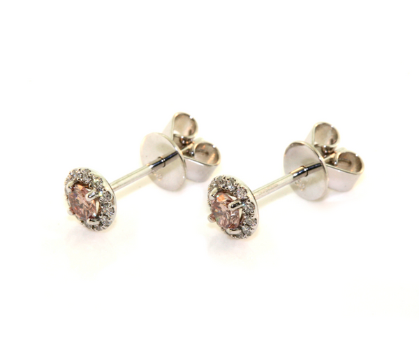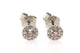 18k White Gold Pink and White Diamond Halo Earrings. The earrings are set with 0.29cts of natural purplish-pink diamonds, clarity SI1-2, with 0.12cts of round white diamonds set into the halos. The earrings are finished with post and heavy scroll fittings.