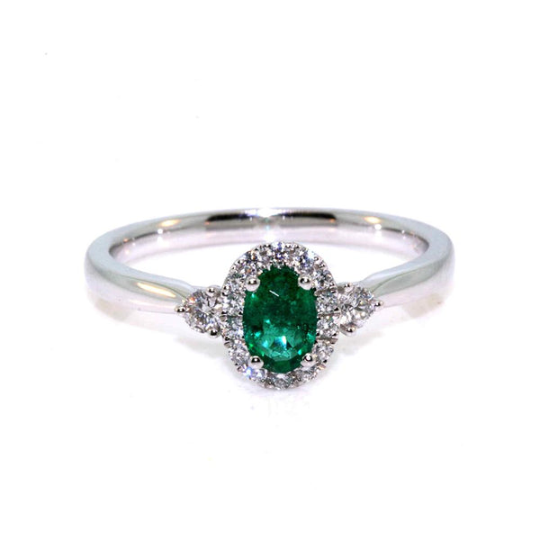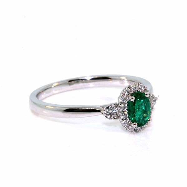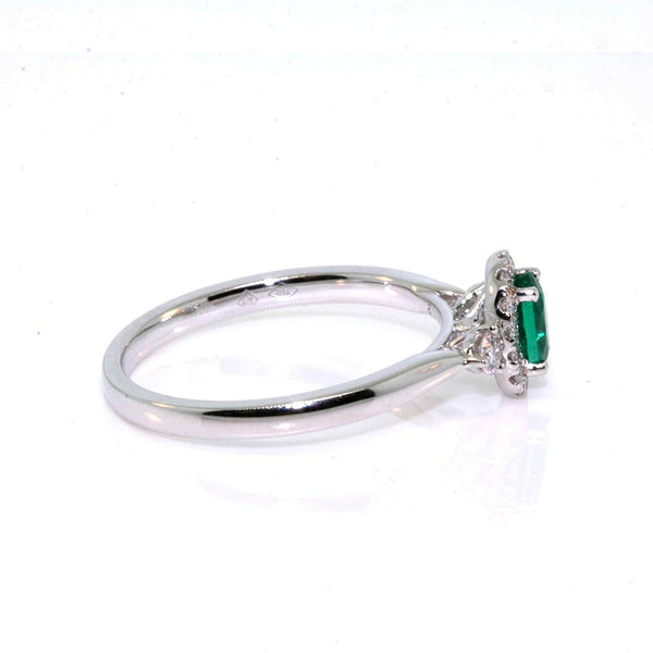 Platinum Zambian emerald and diamond ring.  The ring is set with a 0.66ct oval Zambian emerald, bright green in colour, measuring 6.7 x 4.9mm, and 0.25cts of round brilliant cut diamonds, quality GH colour, VS-SI clarity.
