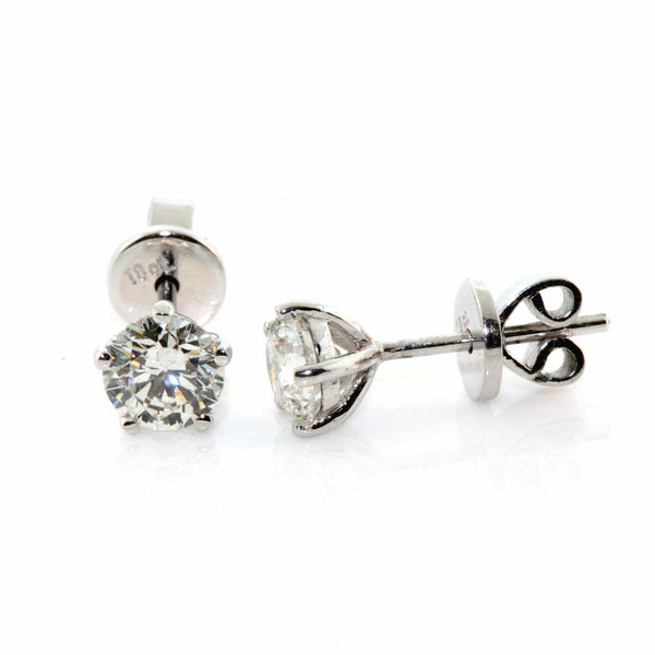 18k white gold five claw diamond stud earrings. The earrings are set with 2 = 1.2cts in total round brilliant cut diamonds, quality H-I colour, SI2-I1 clarity.