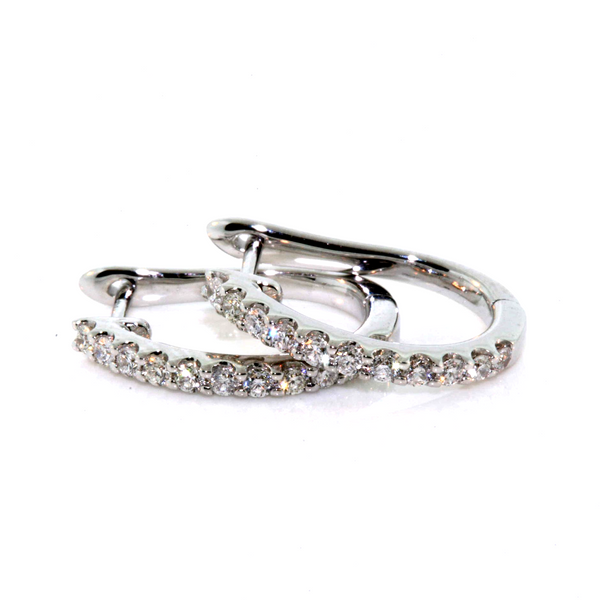 18k white gold diamond set oval hinged hoop earrings. The earrings are set with 0.36cts of round brilliant cut diamonds, quality GH / SI. Currently out of stock.