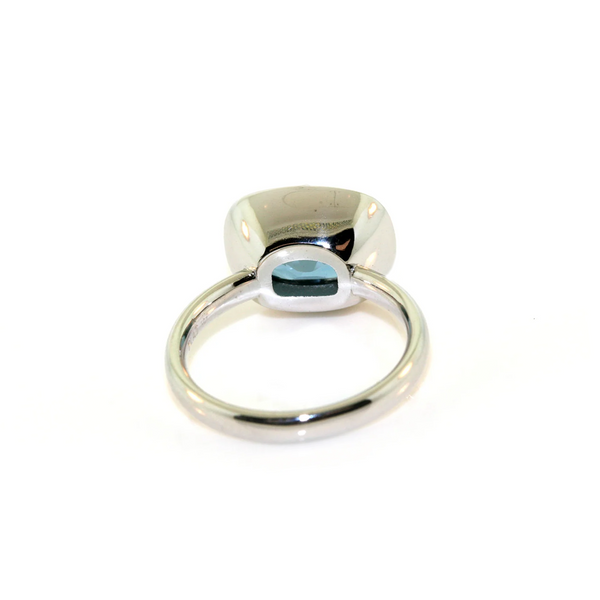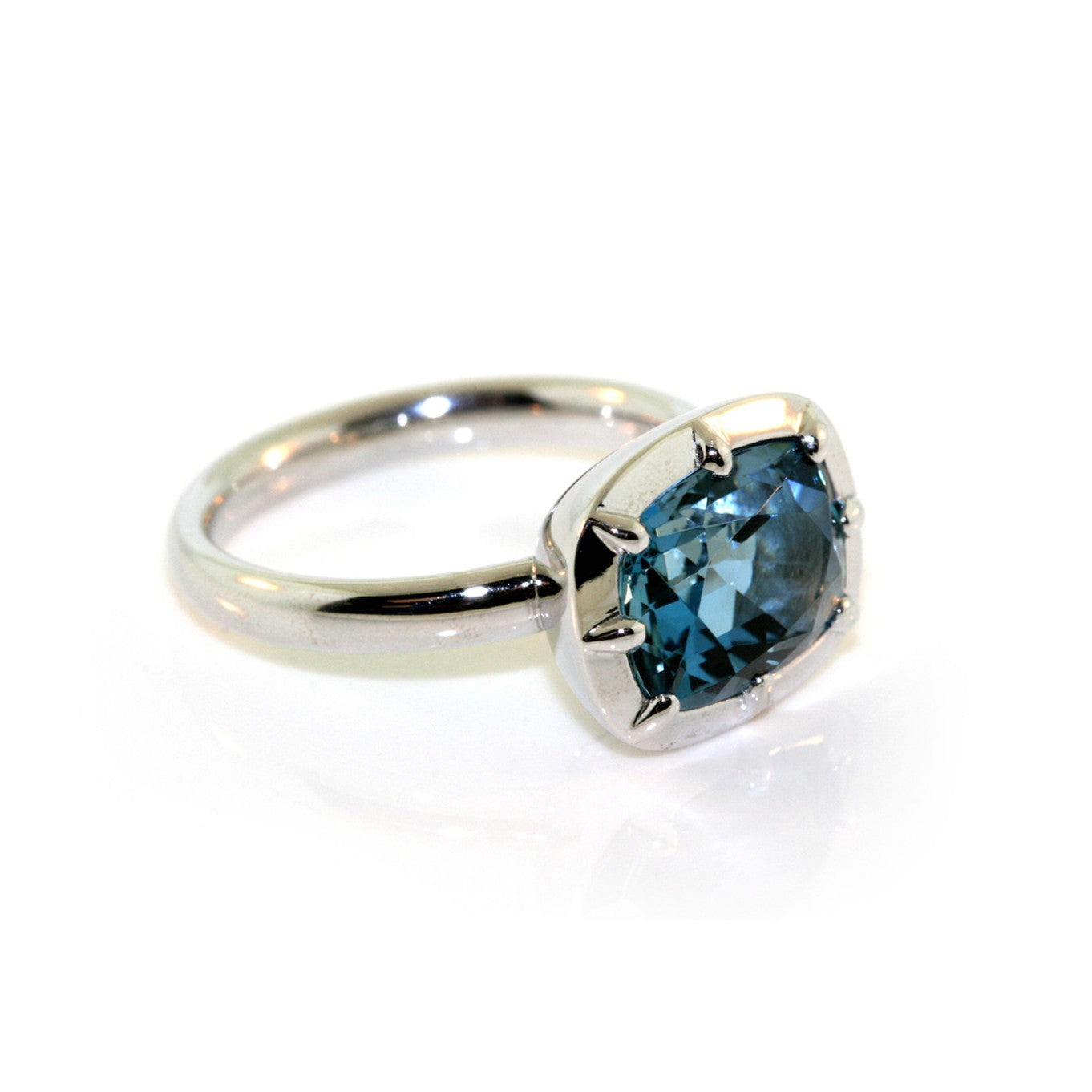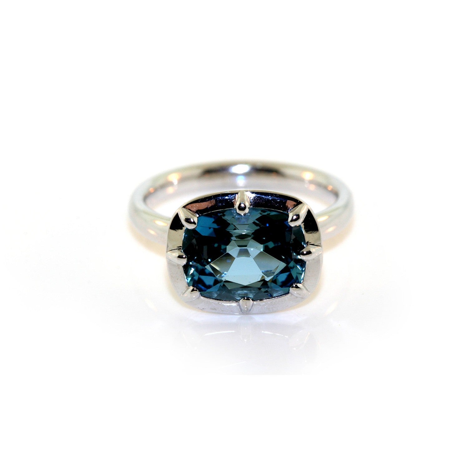 From our workshop, an exceptional quality 3.08ct Aquamarine set into a custom-made platinum button-back ring mount. The cushion cut Aquamarine is from Madagascar, intense blue in colour and measures 11 x 9mm. This stunning ring has recently been sold but a new version of the same design with a different gemstone will be made in the near future.