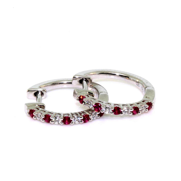 18k white gold ruby and diamond set hoop earrings, small in size. The earrings are each set with 5 round rubies and 4 round brilliant cut diamonds.  The rubies total 0.21cts in weight, and the round brilliant cut diamonds total 0.11cts in weight, quality GH / SI. Currently out of stock.