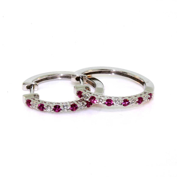 18k white gold ruby and diamond set hoop earrings, large in size. The earrings are each set with 6 round rubies and 5 round brilliant cut diamonds.  The rubies total 0.39cts in weight, and the round brilliant cut diamonds total 0.22cts in weight, quality GH / SI.