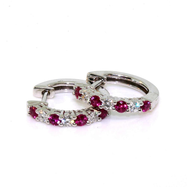 18k white gold ruby and diamond set hoop earrings, medium in size. The earrings are each set with 4 round rubies and 3 round brilliant cut diamonds. The rubies total 0.38cts in weight, and the round brilliant cut diamonds total 0.20cts in weight, quality GH / SI. Currently out of stock.