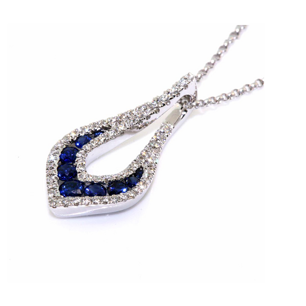 14k white gold sapphire and diamond pendant set with 0.40cts of sapphires and 0.25cts of round brilliant cut diamonds, GH colour and SI2 clarity. The pendant comes with a 14k white gold cable link pendant chain, 45cm in length.
