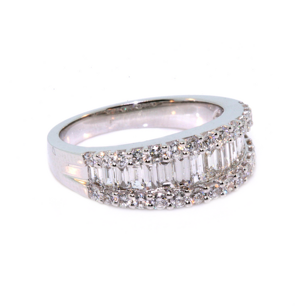 18k white gold diamond three row ring, set with 1.35cts of baguette cut and round brilliant cut diamonds, GH/VS-SI. This ring is made to order in the required finger size.