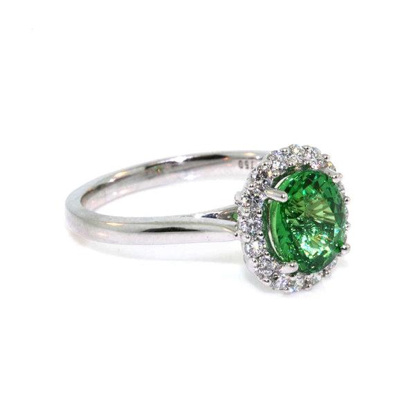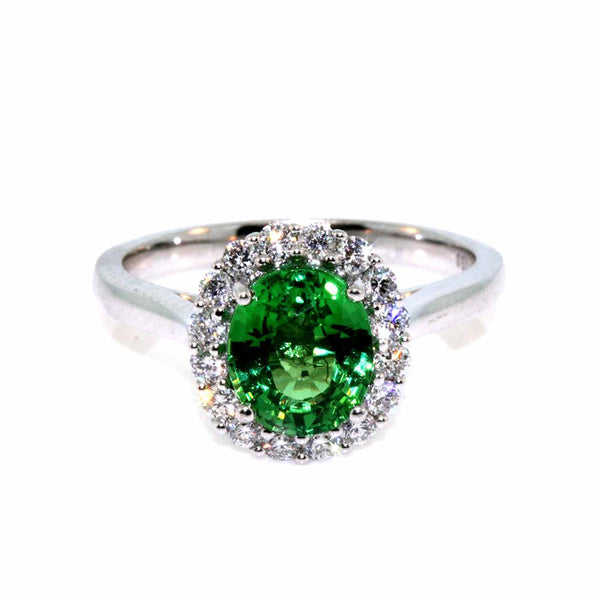 Custom-made 18k white gold Tsavorite garnet and diamond halo ring.  The ring is set with a 2ct oval bright green Tsavorite garnet and 0.35cts of round brilliant cut diamonds, quality FG / VS-SI. This design is made to order in the required finger size, subject to availability of the Tsavorite garnet at the time of order.