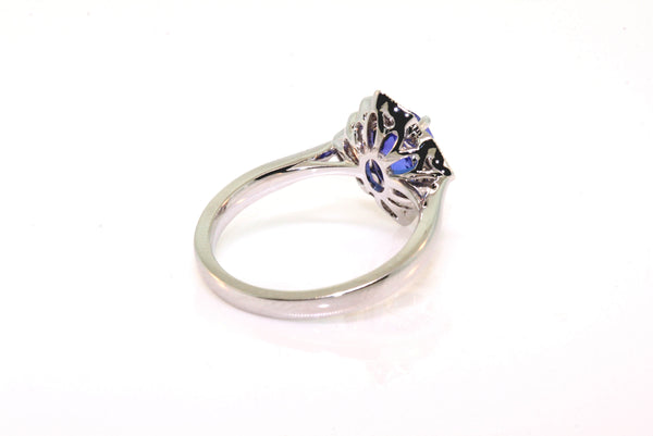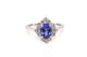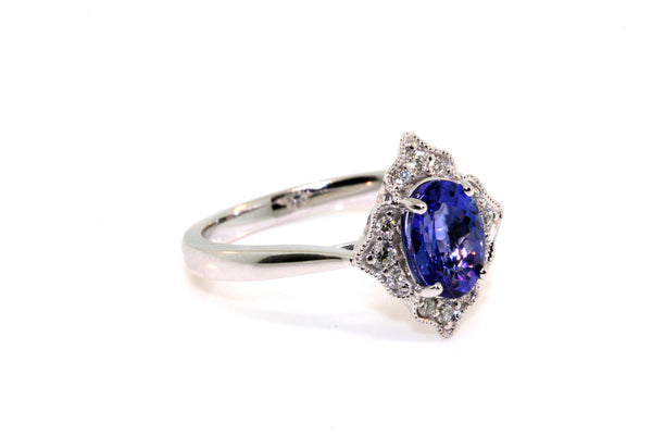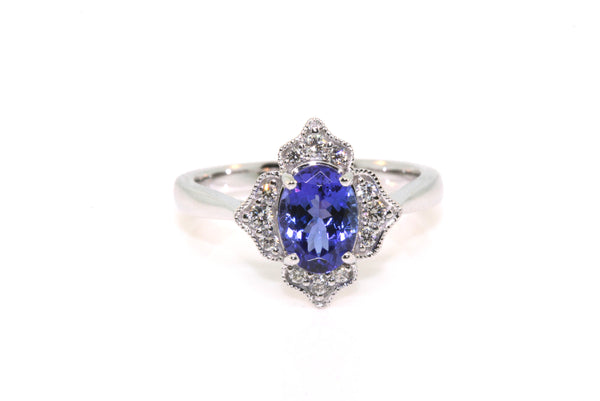 9k White Gold Tanzanite and Diamond Dress Ring. The ring is set with a 1.4ct oval tanzanite, intense violetish blue in colour and measuring 8 x 6mm, and 0.20cts of round brilliant cut diamonds, G-H colour, SI clarity.