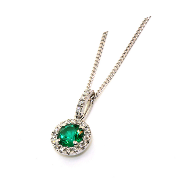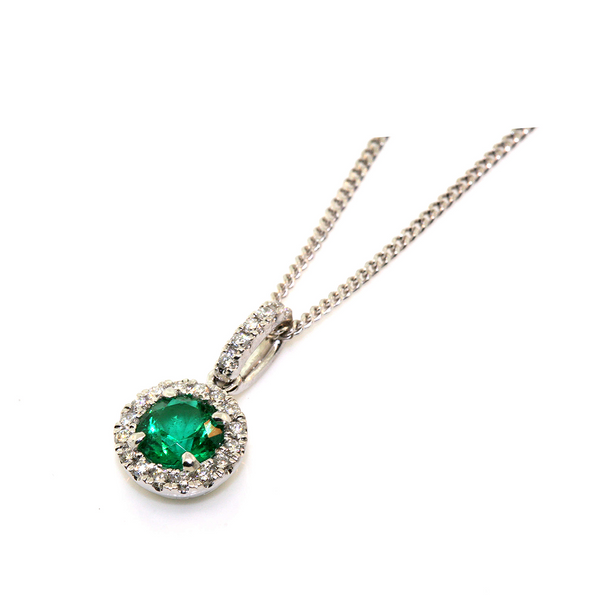 18k white gold emerald and diamond halo pendant. Set with a 0.40ct 5mm Zambian emerald, lightly included with bright green colour, and 0.14cts of round brilliant cut diamonds, GH colour SI clarity. The pendant comes with a 9k white gold curb link chain, 45cm in length, as pictured. Currently out of stock but available to order.