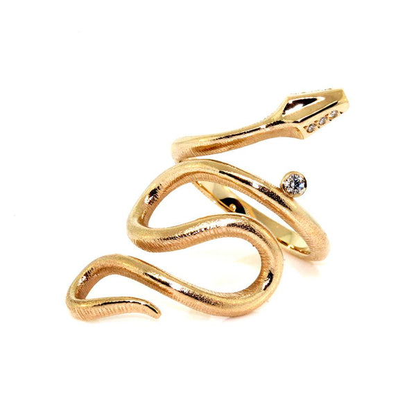 From our workshop, our 9k yellow gold textured snake ring set with 0.08cts of round brilliant cut diamonds, quality FG colour, VS-SI clarity.