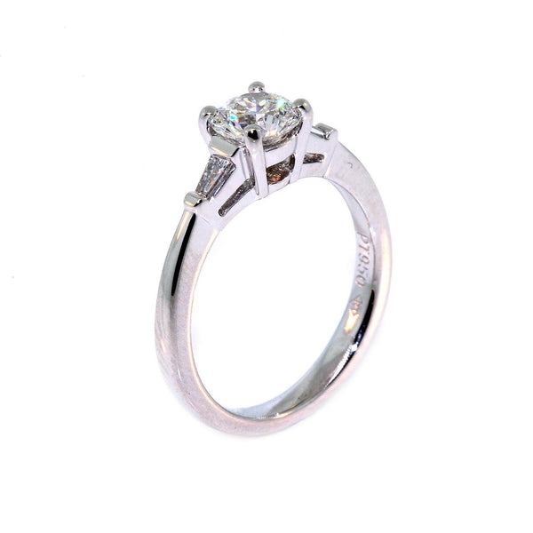Platinum engagement ring set with a round brilliant cut centre diamond, and tapered baguette shoulder diamonds. Pictured with a 0.70ct centre diamond, this design is made to order with you preferred diamond size and quality, and in the required finger size.