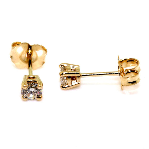 14k yellow gold stud earrings set with 0.30cts (in total) of round brilliant cut diamonds, colour GH, clarity I1. Each diamond is set into a four claw double bezel setting with post and butterfly fittings.
