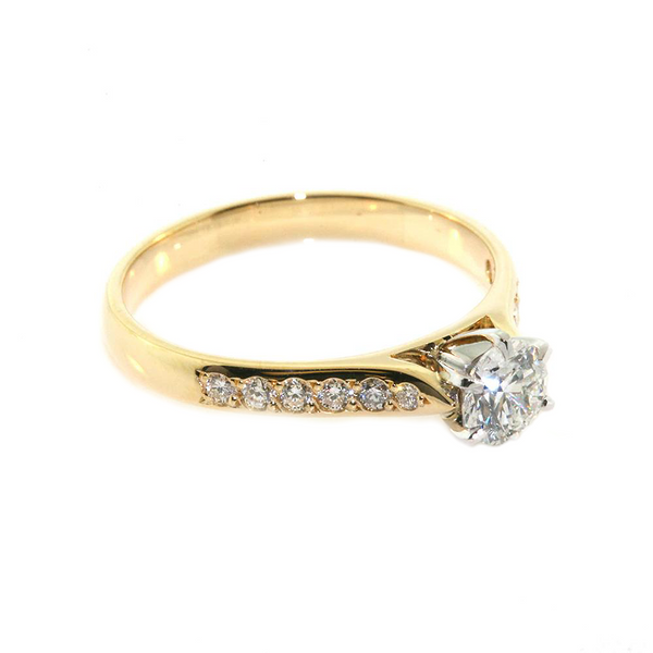 18k yellow gold and platinum solitaire engagement ring. This ring is made to order in the required finger size and the preferred diamond size and quality. Pictured and priced with: