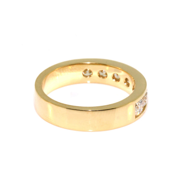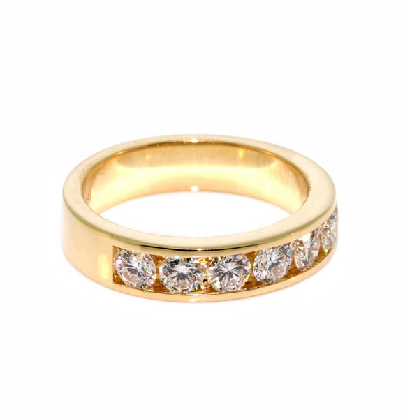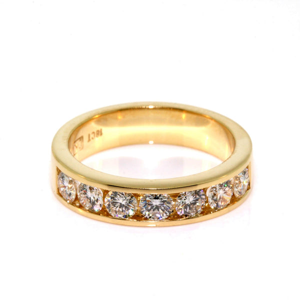 Ladies 18k yellow gold diamond set wedding / eternity style ring. The ring is 4.5mm wide and is channel set with 1.12cts of round brilliant cut diamonds, quality F-G colour, VS-SI1 clarity. Pricing is based on size N, but this design can be specially made in the required finger size.