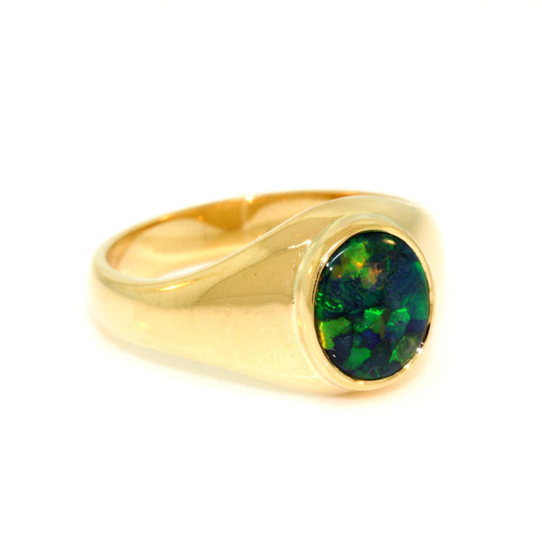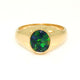 From our workshop, a 1.33ct black opal set into an 18k yellow gold signet style ring mounting. The opal displays blue and green flashes and measures 9.4 x 8.2mm.