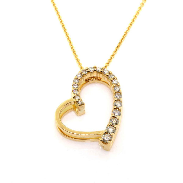 18k yellow gold heart shaped pendant set with 0.43cts of round brilliant cut diamonds, quality GH / SI1-2. The pendant comes with a 9k yellow gold Italian trace chain, 45cm in length. Currently out of stock but available to order.