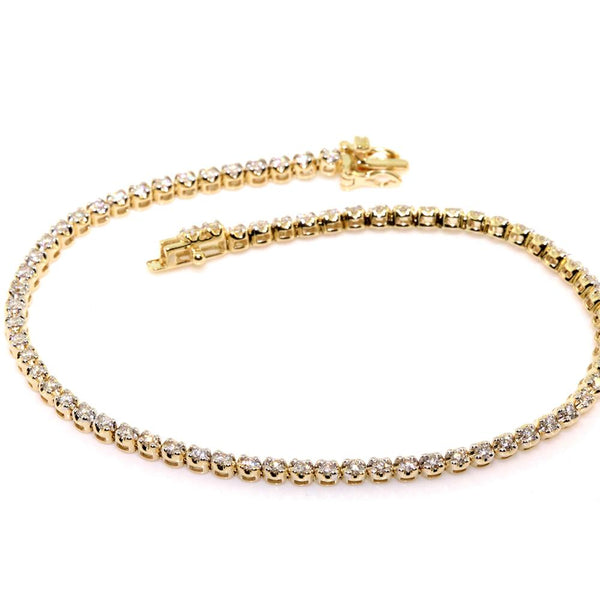 9k Yellow Gold Diamond Tennis Bracelet. The bracelet is set with 1ct of round brilliant cut diamonds, quality GH colour and I1 clarity. The bracelet measures 18.5cm in length but can be ordered in different lengths. Currently out of stock but available to order.