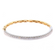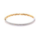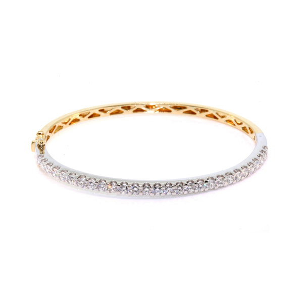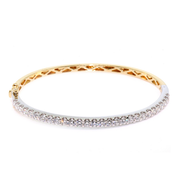 18k yellow and white gold hinged diamond bangle, set with 2.3cts of round brilliant cut diamonds, quality FG colour and SI clarity. This bangle can be ordered in yellow, white or rose gold, or any combination of two gold colours.