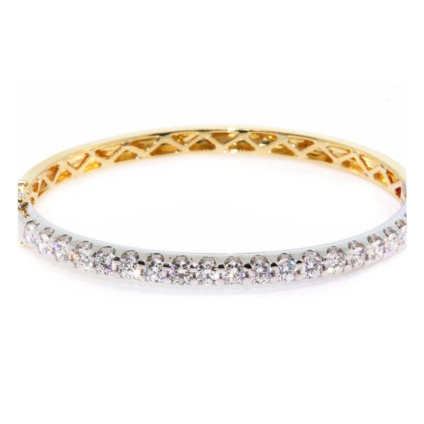 18k yellow and white gold hinged diamond bangle, set with 3.2cts of round brilliant cut diamonds, quality FG colour and SI1-2 clarity.