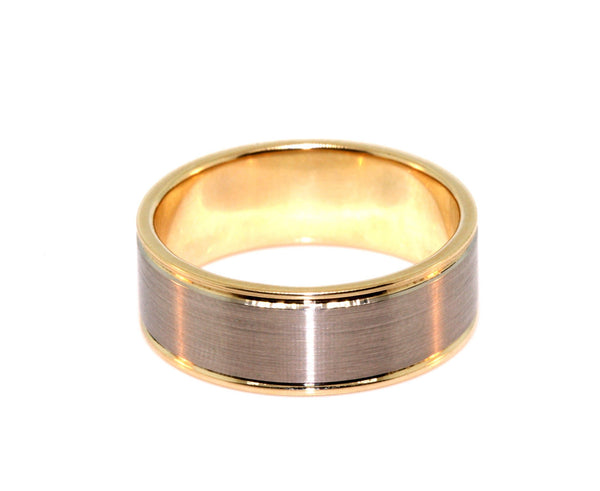 Gent's 9k Yellow Gold and 18k White Gold Wedding Ring. The centre of the ring is brushed finished 18k white gold with 9k yellow gold edges on either side. The ring is 8mm wide and has a flat edge profile.