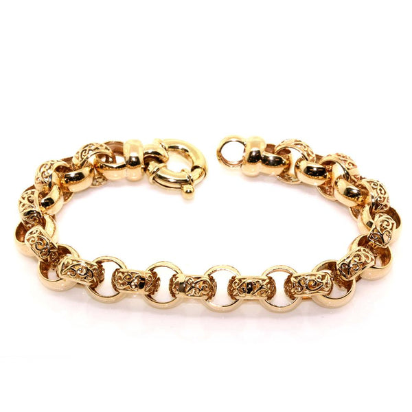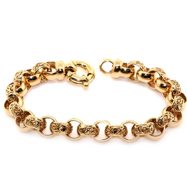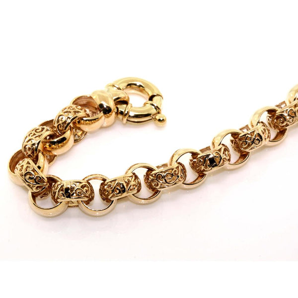 Handfinished 9k Yellow Gold Belcher Link Bracelet. The bracelet features alternating plain and filagree belcher links and is finished with a 15mm jumbo bolt ring. The bracelet is made to order in the required below. Pricing is based on 26 grams in weight and 20cm in length.