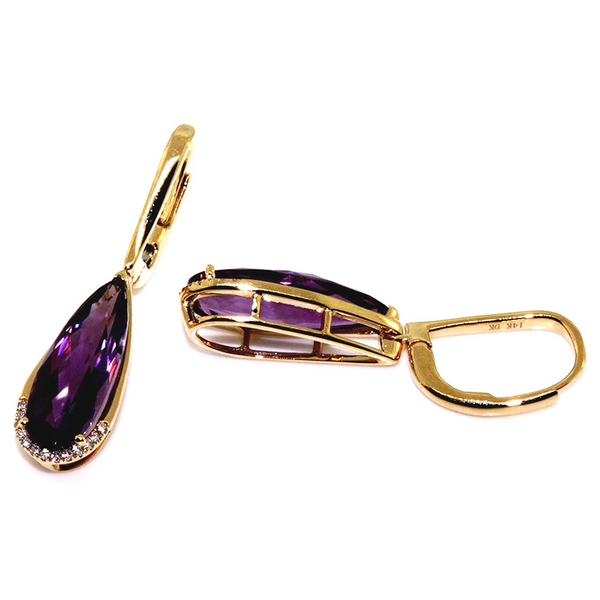 14k yellow gold amethyst and diamond drop earrings, large in size. The earrings are set with 5.38cts of chequerboard cut tear drop shaped amethysts, and 0.08cts of round brilliant cut diamonds, quality GH / SI2-I1.
