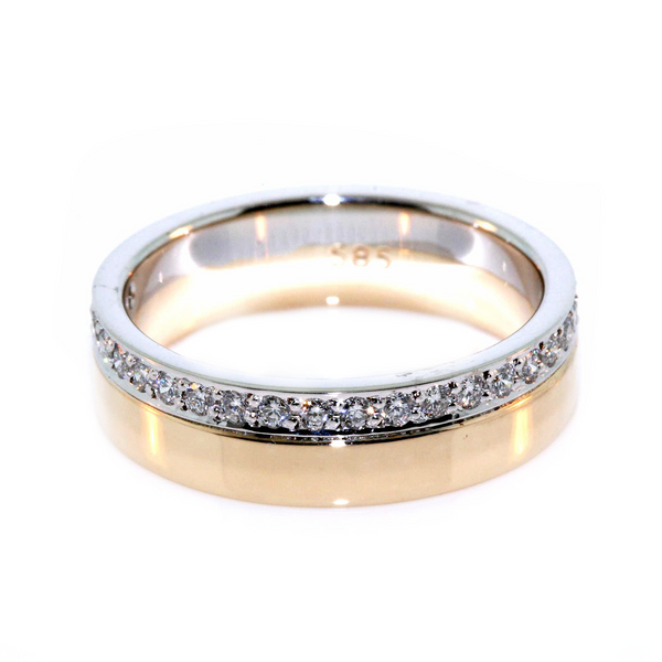 Ladies 18k yellow and white gold diamond set wedding ring. The ring is 5mm wide, with 0.16cts of round brilliant cut diamonds, FG colour, VS-SI clarity, bead set into the white gold edge. This design is made to order in the required finger size. Pricing is based on finger size M-N.