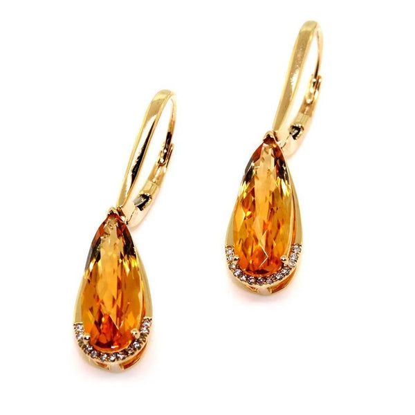 14k Yellow Gold Citrine and Diamond Drop Earrings. The earrings are set with 5.39cts of pear shaped chequerboard cut citrines, and 0.08cts of round brilliant cut diamonds. Currently out of stock.