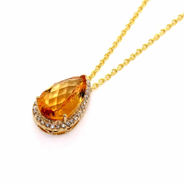 14k yellow gold citrine and diamond halo pendant. The pendant is set with a 4ct tear drop shaped citrine and 0.17cts of round brilliant cut diamonds, quality GH / SI2-I1. The pendant is finished with a 14k yellow gold cable link pendant chain, 45cm in length.