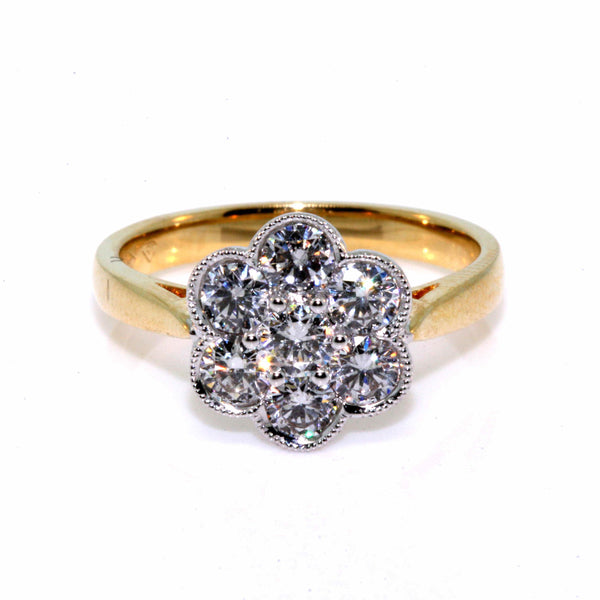 18k yellow and white gold diamond cluster, set with 1.04cts of round brilliant cut diamonds, GH/SI. Currently out of stock.