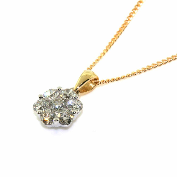 18k yellow and white gold diamond cluster pendant, set with 0.44cts of round brilliant cut diamonds, quality GH / SI.  The pendant comes with a 9k yellow gold curb link pendant chain 45cm in length.