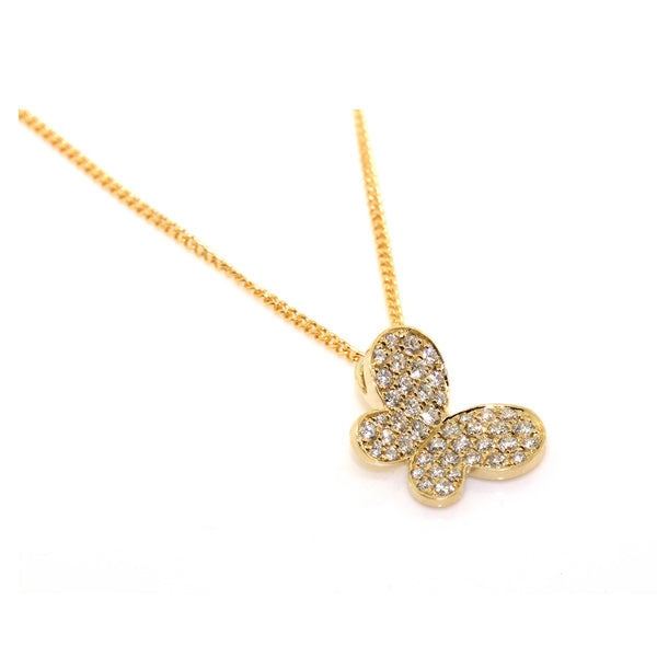 14k Yellow Gold Diamond Set Butterfly Pendant set with 0.31cts of round brilliant cut diamonds, quality GH colour, SI clarity. The pendant comes with a 9k yellow gold curb link chain, 45cm in length. Currently out of stock but available to order.