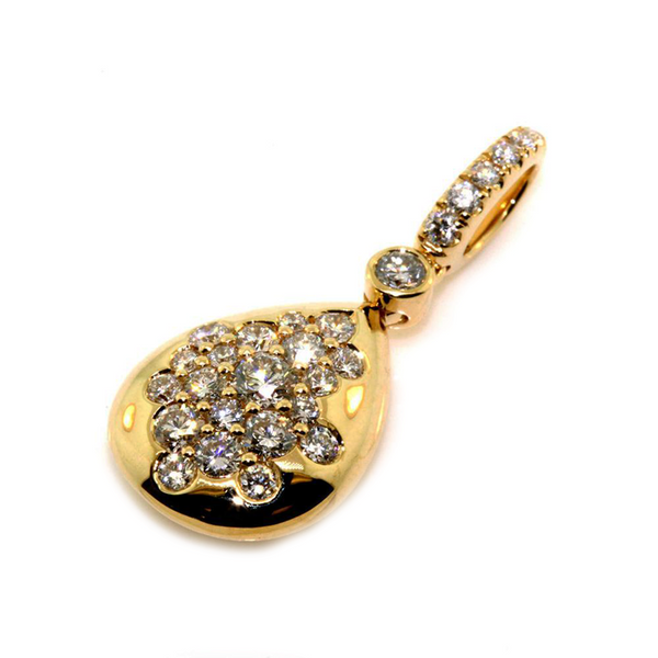 18k yellow gold tear drop pendant set with 0.64cts of round brilliant cut diamonds, quality FG / SI1-2. The pendant comes with a 9k yellow gold belcher link chain, 45cm in length.