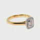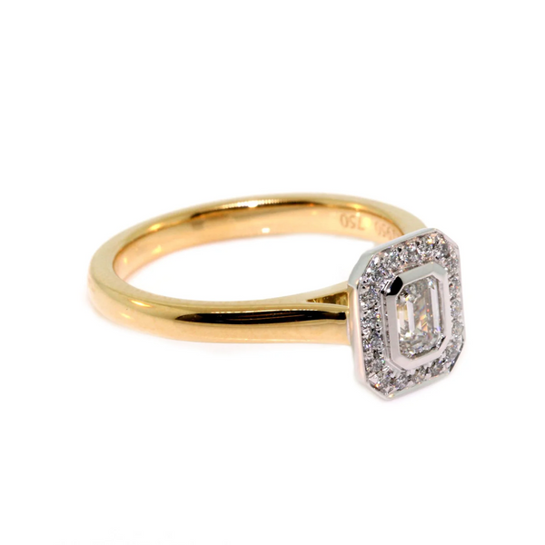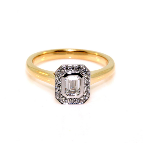 18k yellow gold and platinum emerald cut diamond halo ring. The ring is set with a 0.30ct emerald cut diamond, G-H colour, VS1-2 clarity, with 0.12cts of round brilliant cut diamonds set into the halo, F-G colour, VS-SI clarity
