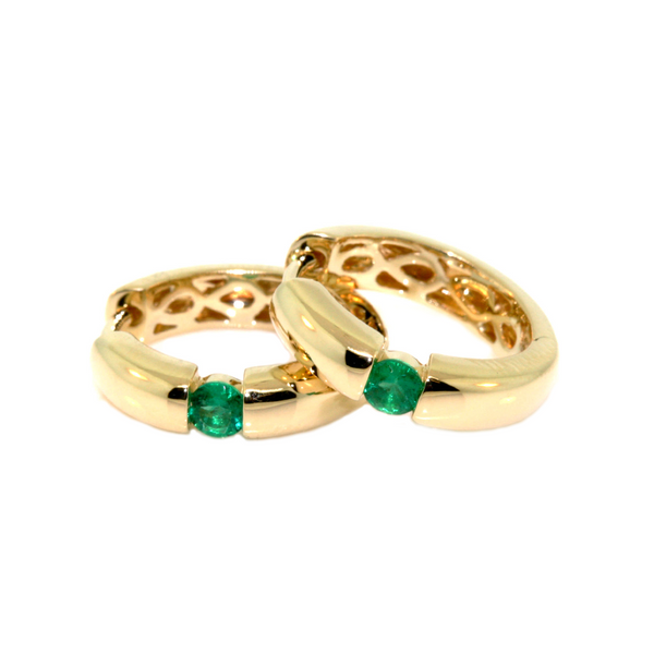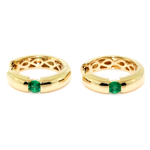 Ladies 14k Yellow Gold Emerald Hoop Earrings. Each earring is set with a 3mm round Emerald.