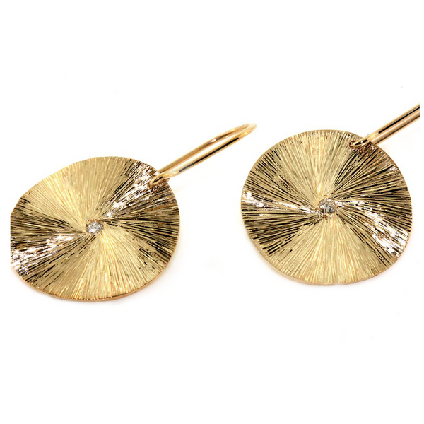 Hand-carved 9k yellow gold disc drop earrings set with 0.06cts of round brilliant cut diamonds, quality FG / VS-SI1. The sunray pattern has been hand-carved into the discs by our jewellers.