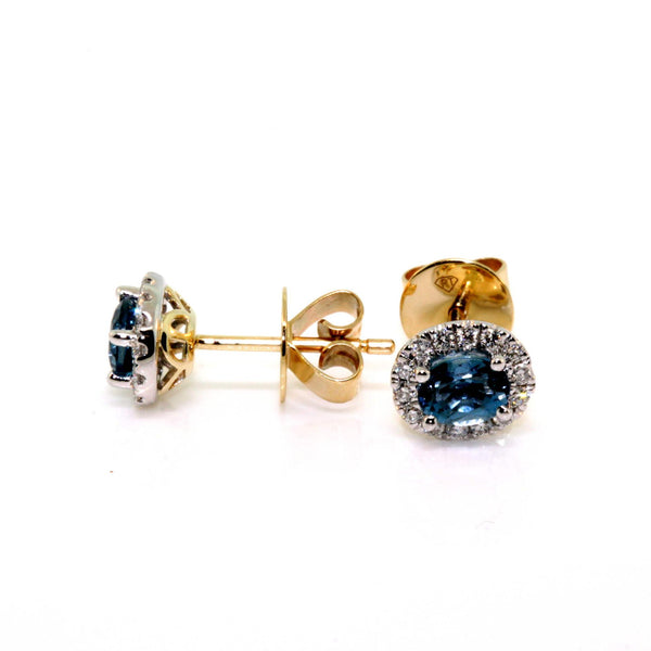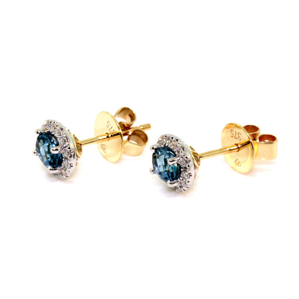 9k yellow and white gold London blue topaz and diamond halo stud earrings. The earrings are set with two 5x4mm oval London blue topaz and 0.22cts (in total) of round brilliant cut diamonds, colour GH, clarity SI. The earrings are finished with post and butterfly fittings. Currently out of stock.