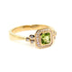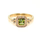 9k yellow gold peridot and diamond ring, set with a 0.58ct octagonal peridot, measuring 5 x 4.5mm, and 0.16cts of round brilliant cut diamonds set into the halo and shoulders, G-H colour, and SI clarity. This design is made to order in the required finger size.
