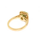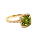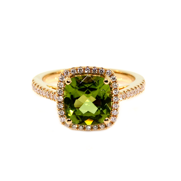 18k Yellow Gold Peridot and Diamond Halo Dress Ring. The ring is set with a 2.98ct cushion shaped peridot, measuring 9 x 8.5mm, and 0.30cts of round brilliant cut diamonds, quality GH colour, SI clarity. This ring is made to order in the required finger size.