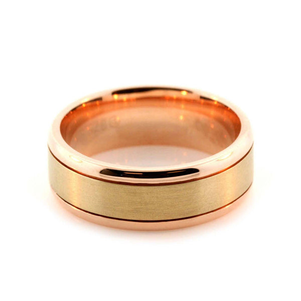 Gent's 9k rose and yellow gold wedding ring. The centre of the ring is brushed finished yellow gold with polished rose gold edges. The ring is 7mm wide and is from the Dora Collection. The ring is made to order in the required finger size.