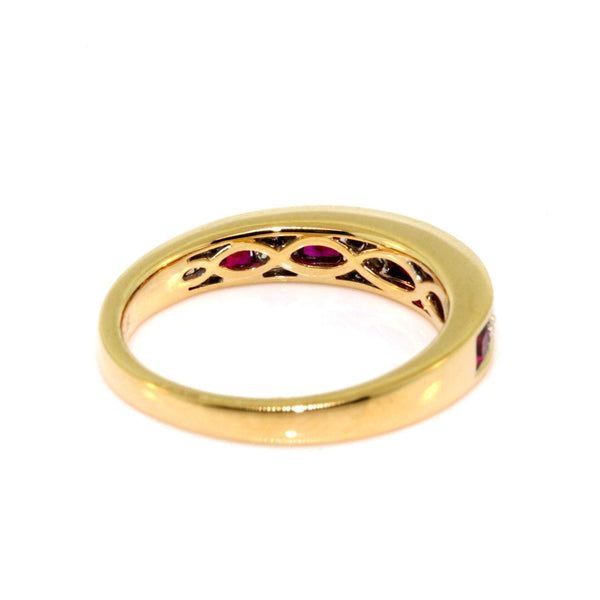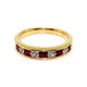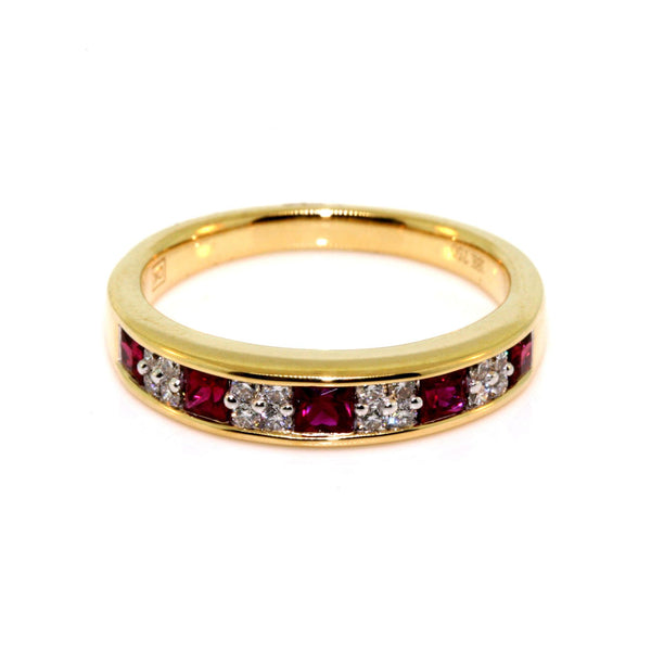 18k yellow gold ruby and diamond eternity style ring. The ring is set with 0.65cts of square rubies and 0.16cts of round brilliant cut diamonds, G-H colour, VS-SI clarity.