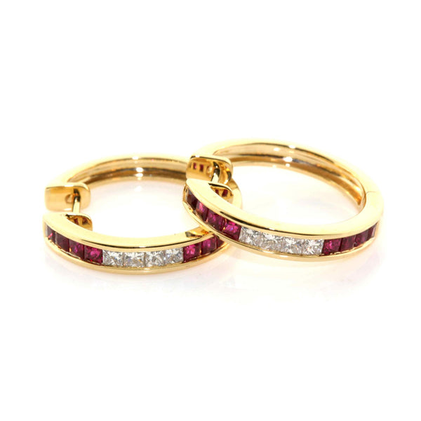 18k yellow gold ruby and diamond hinged hoop channel set earrings. The earrings are set with 0.80cts of square rubies and 0.30cts of princess cut diamonds, quality GH / VS-SI. Currently out of stock.