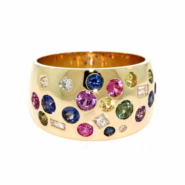 9k yellow gold sapphire and diamond dome ring. The ring is set with 1.7cts of multi-coloured sapphires and 0.27cts of baguette, princess and round brilliant cut diamonds, FG/VS-SI. This ring is made to order in the required finger size.