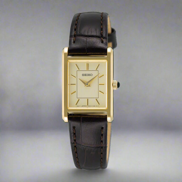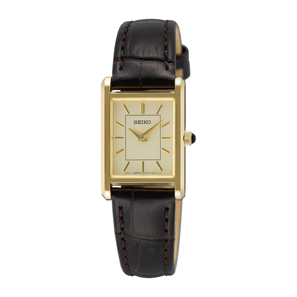 Ladies Seiko Conceptual Yellow Gold PVD on Stainless Steel Rectangular 19.6 x 29.4mm Case with Brown Croco-Pattern Leather Strap Gold Coloured Dial with Gold Coloured Hands and Indexes Sapphire Crystal Glass Quartz Watch. Currently out of stock.
