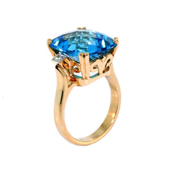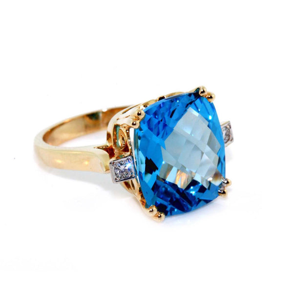 9k yellow gold dress ring set with a 9ct cushion cut Swiss blue topaz and 0.06cts of round brilliant cut diamonds, FG/VS-SI. Currently out of stock.